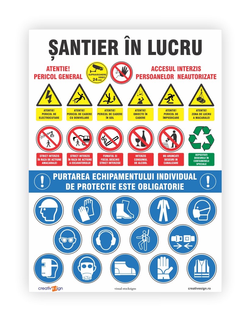 Instalare: bannerul trebuie instalat la o înalțime corespunzatoare, orientat în funcție de unghiul de vedere, ținându-se seama de eventualele obstacole, fie la intrarea intr-o zonă in cazul unui risc general, fie în imediata apropiere a unui risc determinat sau a obiectului ce trebuie semnalat și într-un loc bine iluminat, ușor accesibil si vizibil. In cazul in care condițțiile de iluminare naturala sunt precare, trebuie utilizate culori fosforescente, materiale reflectorizante sau iluminare artificială, fară a aduce atingere prevederilor legislatiei nationale care transpun Directiva 89/654/CEE.