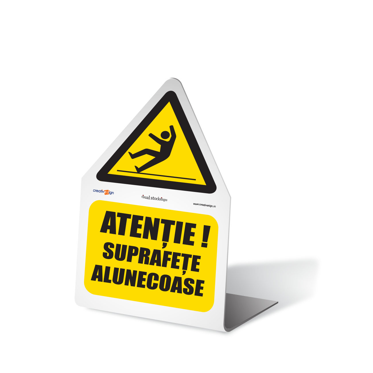 suprafață lucioasă, rezistență sporită la impact, la intemperii, la agenti chimici și la coroziune. Utilizare: Indicatorul trebuie pozitionat astfel incat fiecare persoana sa fie avertizata de riscul de accidentare datorat unei suprafete alunecoase.