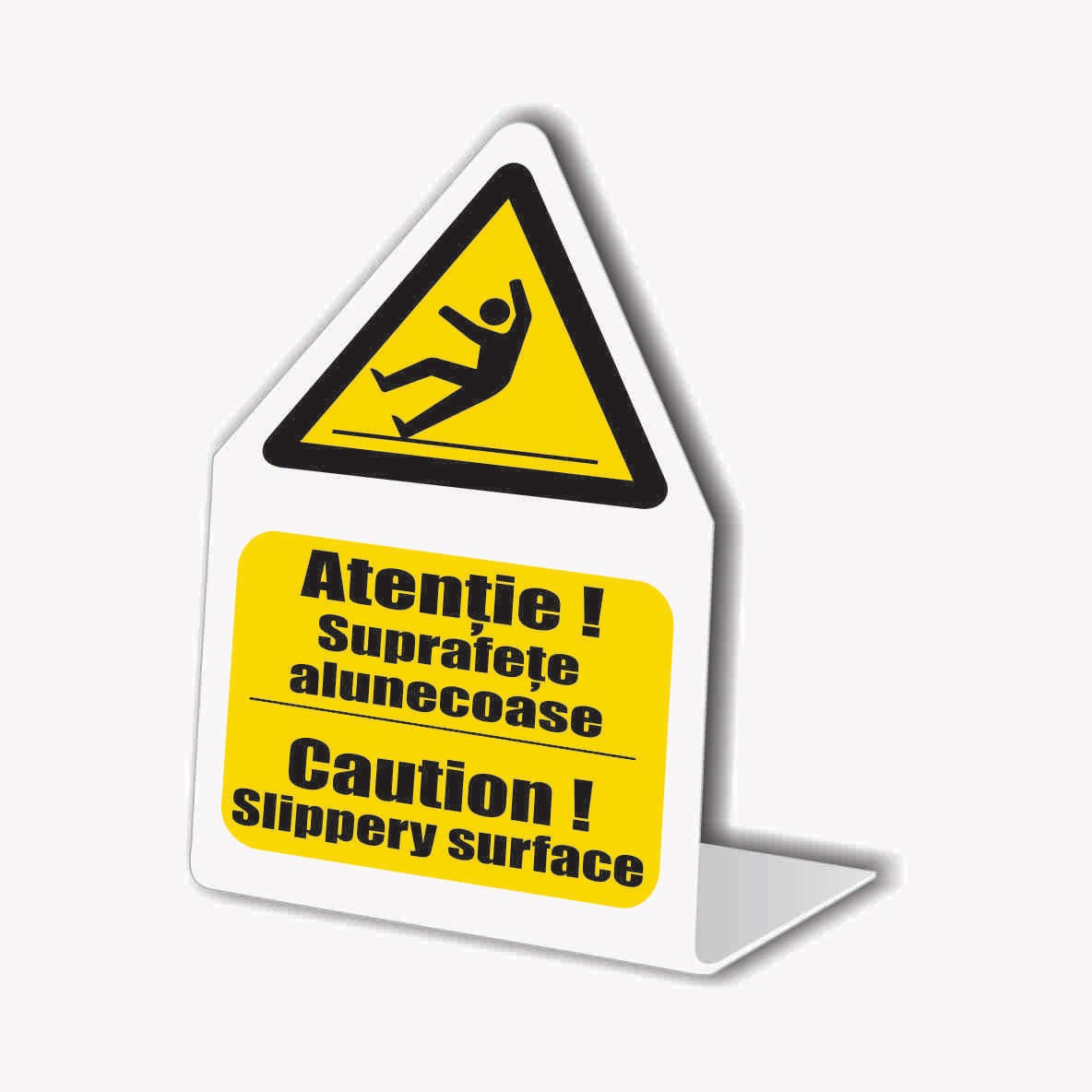 suprafață lucioasă, rezistență sporită la impact, la intemperii, la agenti chimici și la coroziune. Utilizare: Indicatorul trebuie pozitionat astfel incat fiecare persoana sa fie avertizata de riscul de accidentare datorat unei suprafete alunecoase.